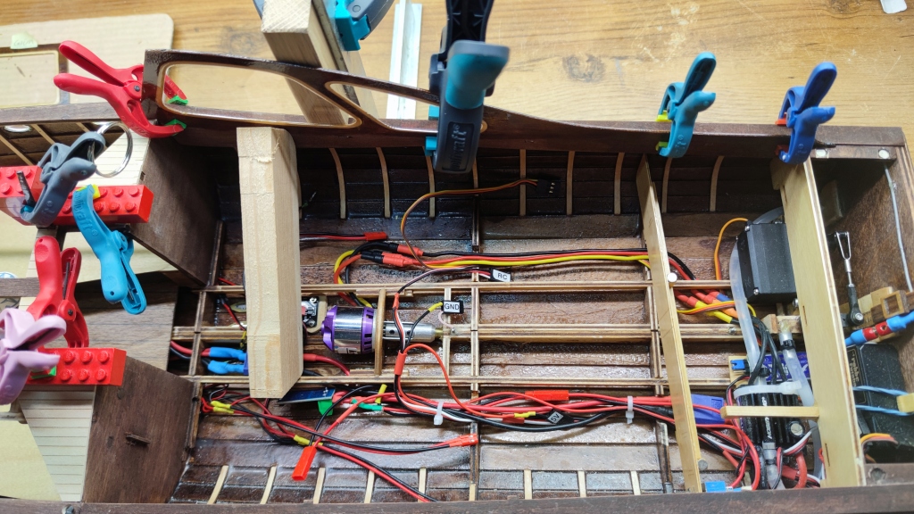 Nach dem trocknen des Bootslacks ging es an den Einbau und die Verkabelung von Motor, Fahrtregler, Rudergarnitur mit Servo, des Empfängers und der Akkus. Der Einbau der LiPos war ein bisschen problematisch, da sich die Steckverbindungen beim Ein- und Ausbau der Akkus immer mal wieder am 2ten Spant verhakten. Durch Kürzung der Kabel an den Akkus und der Montage von Leitbrettchen aus Holz am Spant konnte eine nachhaltige Lösung dafür gefunden werden. Diese funktioniert auch mit den Halterungen für das Brett der fortgesetzten Sitzbank zwischen dem ersten und dem zweiten Spant in der Kabine.