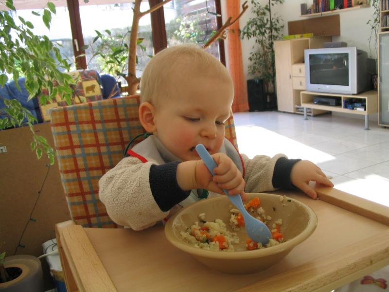 Meine Milchflaschenhandhabung hat Mama endlich davon überzeugt, daß ich für "selber Löffeln" bereit bin. Ich darf nun hin und wieder mit meinem Löffel selbst im Esssen rumstochern und kann sogar schon Brocken in den Mund führen. Ok, ab und an muß meine Hand dann doch noch helfen.