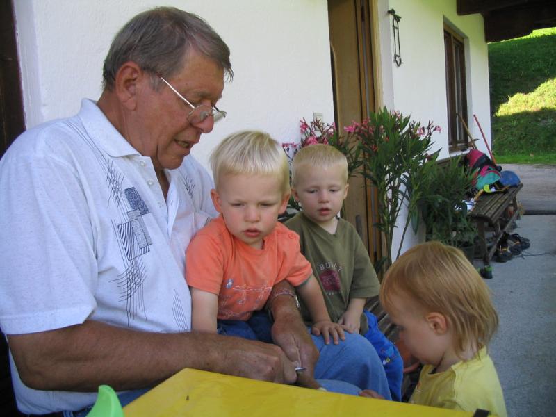 Von meinen großen Cousins hab ich mir dann noch abgeschaut, wie man klettert, Ball spielt, Steine und Äpfel wirft, Quatsch macht und warten muß, bis man bei Opa an der Reihe ist. Da ich auch Holz hacken, Auto und Landmaschinen fahren gelernt habe und sich mein Wortschatz massiv erweitert hat, war es alles in allem eine sehr erfolgreiche Woche.