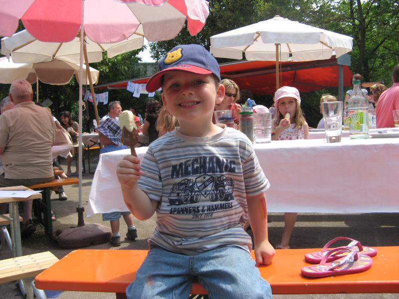 Der Sommer ist jetzt auch endlich ausgebrochen und wir können mal ins Freibad, ins Planschbecken, nackig ohne Decke schlafen usw. Und die „Festivitäten” sind wieder voll im Gange. So war KindergartenSommerfest und Turnfest mit Glückskäfercup für den Lukas, wo er sich wacker geschlagen und eine Urkunde und Medaille bekommen hat.