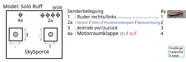 Nachsatz 2: Als Vorbereitung der Modernisierung des Schlumpfo sind nun die 4 oberne Kanäle als Schaltmodul auf die rechte Seite gewandert und dem Proportionalkanal 3 wurden zwei zusätzliche Ein/Aus-Schalter auf der linken Modulseite beigepackt. Der Kanal 3 am Steuerknüppel ist daher nun totgelegt. Die Hardware und Software Umsetzung dises von mir als SwitchProp bezeichneten Modules habe ich auf meinen Bastelprojektseiten dargestellt.